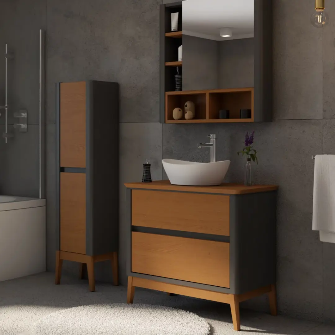 Destacamos el elegante gabinete de MDF de alta densidad, resaltando su funcionalidad y distinción en cada detalle. Su interior, con placa de MDF gris de 15mm y acabado resistente a la humedad, asegura protección y durabilidad para tus pertenencias. Las guías telescópicas “Soft-Close” brindan un cierre suave y silencioso, evitando ruidos molestos, mientras que las sólidas patas de madera maciza garantizan estabilidad en cualquier entorno.
